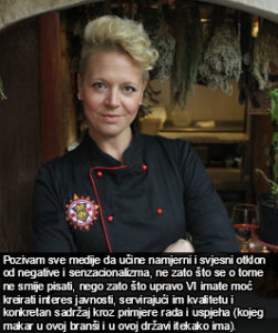 Stoga, u svoje ime, u ime svih kolegica i u ime gastronomije generalno, pozivam sve medije da učine namjerni i svjesni otklon od negative i senzacionalizma, ne zato što se o tome ne smije pisati (dapače, na nepravdu treba ukazivati i protiv nje se treba boriti), nego zato što upravo VI imate moć kreirati interes javnosti, servirajući im kvalitetu i konkretan sadržaj kroz primjere rada i uspjeha (kojeg makar u ovoj branši i u ovoj državi itekako ima).